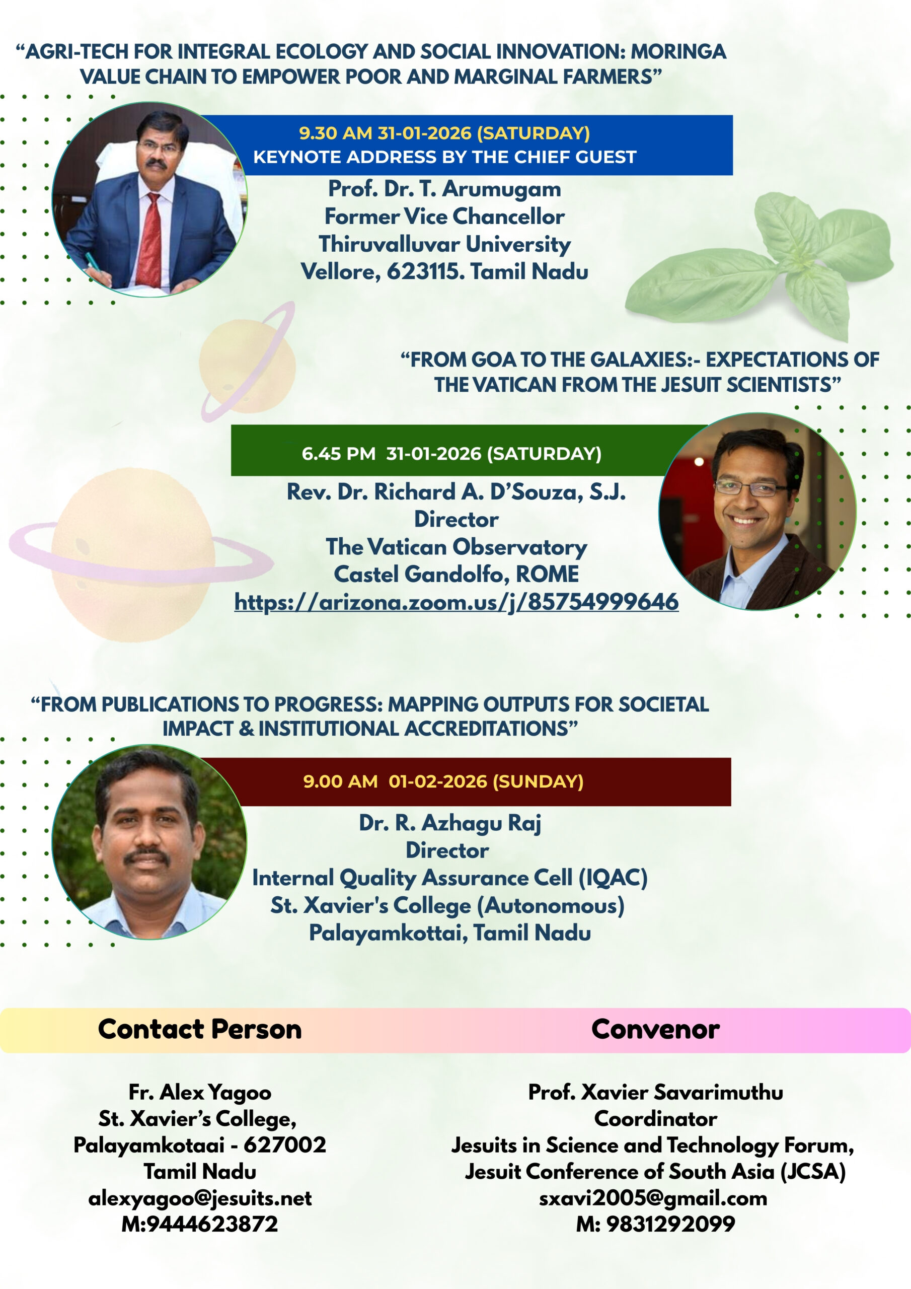 “The cry of the people and the cry of the earth” formed the prophetic and unifying vision of the two-day International Conference organized by the Jesuits in Science and Technology Forum (JISTF) at St. Xavier’s College (Autonomous), Palayamkottai, Tamil Nadu, from 31 January to 1 February 2026. Rooted in this twin cry, the conference articulated a clear Jesuit vision of science: research is not pursued for its own sake, but as a mission-oriented endeavour meant to serve people, heal social wounds, and promote ecological sustainability. Titled “Jesuits in the Frontiers of Planetary Healing Research,” the conference brought together 23 Jesuit scientists, educators, and researchers from the Andhra, Calcutta, Darjeeling–Nepal, Gujarat, Madurai, Karnataka, and Patna Provinces working in diverse disciplines to reflect on how scientific inquiry, inspired by faith and justice, can contribute meaningfully to planetary healing and integral human development.
